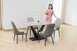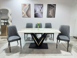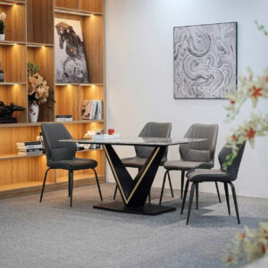Điểm đắt giá nhất là mặt bàn Ceramic với khả năng “thách thức” thời gian: chống xước cực tốt, chống ố tuyệt đối và chịu được nhiệt độ cao từ những nồi lẩu nóng hổi. Hệ khung chân bàn V không chỉ vững chãi mà còn được xử lý kỹ thuật giúp chống sét, rỉ, kết hợp cùng nẹp vàng lấp lánh tạo nên vẻ đẹp đẳng cấp, hiện đại.